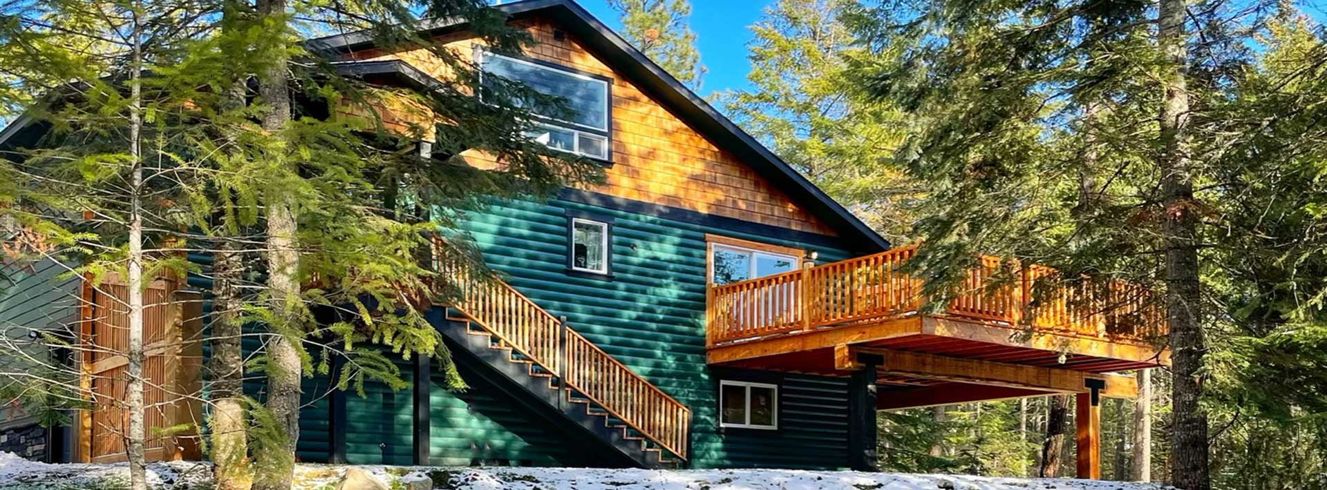 The main bedroom features a king sized handcrafted rustic log bed. The natural wood bed brings the beauty of the outside forest inside, to the bedroom suite. The rustic charm of the main bedroom with overstuffed comforter creates a cozy sleeping atmosphere. The matching furnishings also incorporates the indigenous regional wild life.