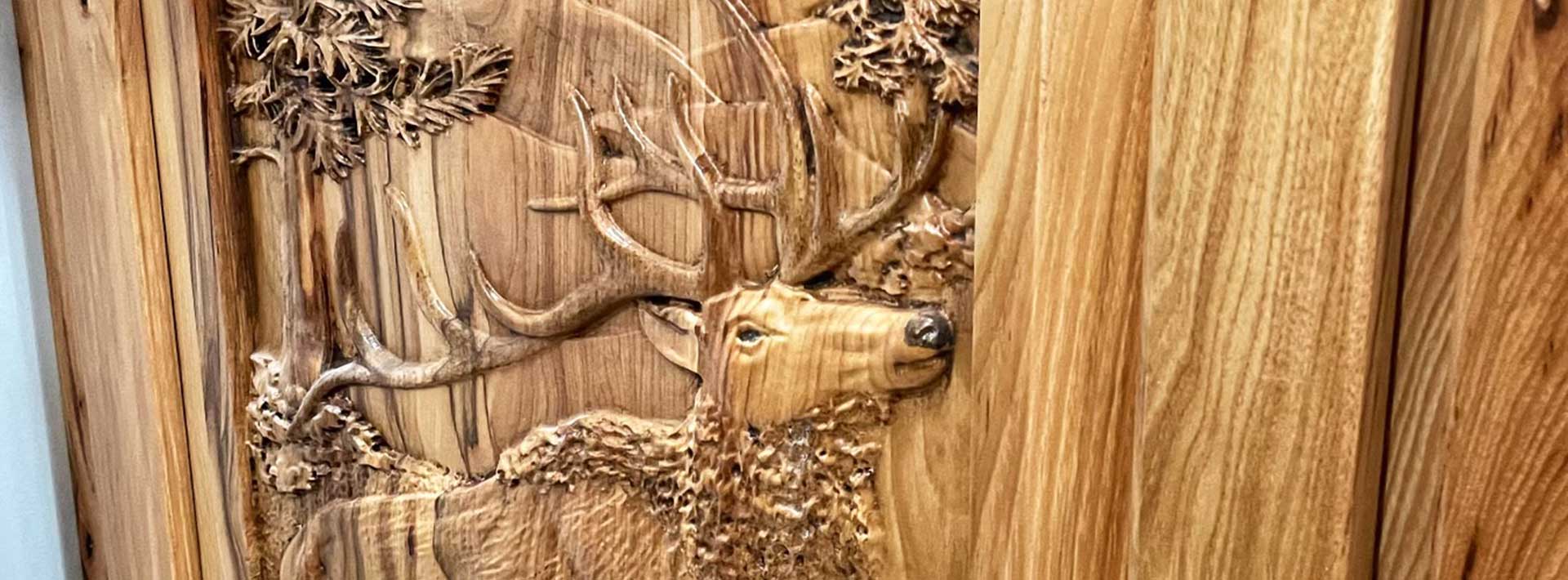 The main bedroom features a king sized handcrafted rustic log bed. The natural wood bed brings the beauty of the outside forest inside, to the bedroom suite. The rustic charm of the main bedroom with overstuffed comforter creates a cozy sleeping atmosphere. The matching furnishings also incorporates the indigenous regional wild life.