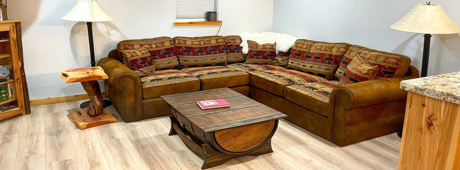 The main bedroom features a king sized handcrafted rustic log bed. The natural wood bed brings the beauty of the outside forest inside, to the bedroom suite. The rustic charm of the main bedroom with overstuffed comforter creates a cozy sleeping atmosphere. The matching furnishings also incorporates the indigenous regional wild life.