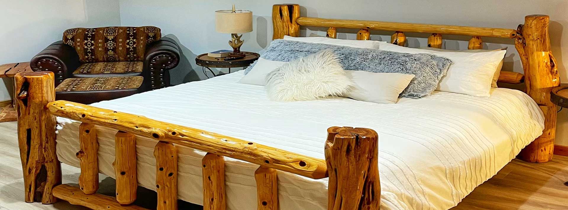The main bedroom features a king sized handcrafted rustic log bed. The natural wood bed brings the beauty of the outside forest inside, to the bedroom suite. The rustic charm of the main bedroom with overstuffed comforter creates a cozy sleeping atmosphere. The matching furnishings also incorporates the indigenous regional wild life.