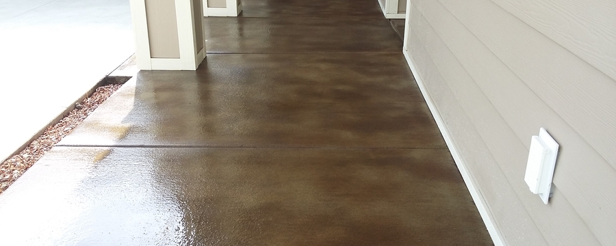 Acid staining is not a dyeing or pigment-base coloring systems, but a chemical reaction. A mixture of water, mineral salts and a slight amount of muriatic acid is applied to the concrete surface. This chemical reaction with the existing minerals (primarily lime) in the concrete over a period of one to four hours creates new earth tone colors on the concrete surface. The concrete surface is later scrubbed to remove excess stain and neutralized by a basic solution of ammonia and water or baking soda (less likely to cause whiting later) to help raise the ph level back to normal level. Due to inconsistencies in the surface level of concrete floor, acid staining creates a variegated or mottled appearance that is unique to each slab. The color penetration ranges from 1/16 to 1/32 of an inch. Older exterior concrete surfaces may not color as well as interior surfaces because the environment has leached or percolated out the mineral content. As well, any exposed aggregate (rocks) in worn concrete will not accept staining.